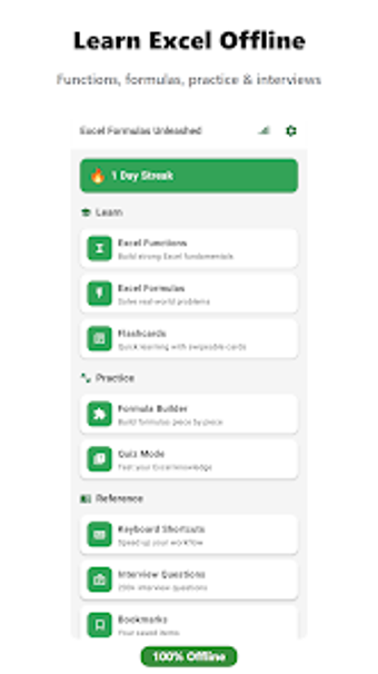 Excel Formulas Unleashed är en utbildningsapp för Android som hjälper användare att bemästra Excel-formler och förbereda sig för jobbintervjuer utan internetanslutning. Med interaktiv träning, en omfattande offline-referens och rollbaserade intervjufrågor är appen utformad för att möta verkliga arbetskrav. Användare kan lära sig både grundläggande och avancerade funktioner, inklusive moderna Excel-funktioner som FILTER och XLOOKUP, vilket gör den idealisk för studenter och yrkesverksamma.